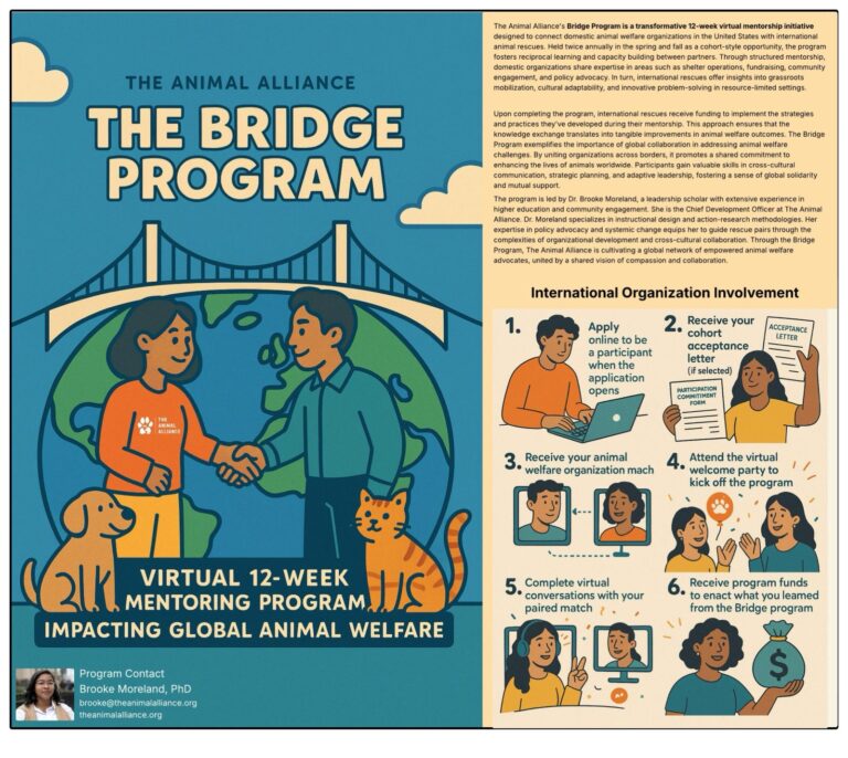 is a unique 8–12 week virtual experience that connects United States based and international animal welfare organizations through reciprocal mentorship and shared learning. This cohort-based program fosters real relationships, empowers global knowledge exchange, and highlights best practices that strengthen both local and international impact.